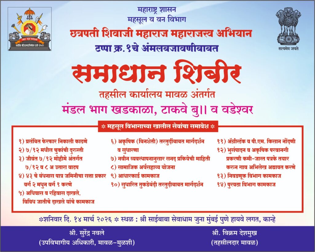 महाराष्ट्र शासनाच्या महसूल व वन विभागामार्फत राबविण्यात येणाऱ्या “छत्रपती शिवाजी महाराज महाराजस्व अभियान” अंतर्गत मावळ तहसील कार्यालयाच्या वतीने समाधान शिबीर आयोजित करण्यात आले आहे. हे शिबीर मावळ तालुक्यातील खडकाळा, टाकवे बु. आणि वडेश्वर मंडळातील नागरिकांसाठी आयोजित करण्यात आले आहे.