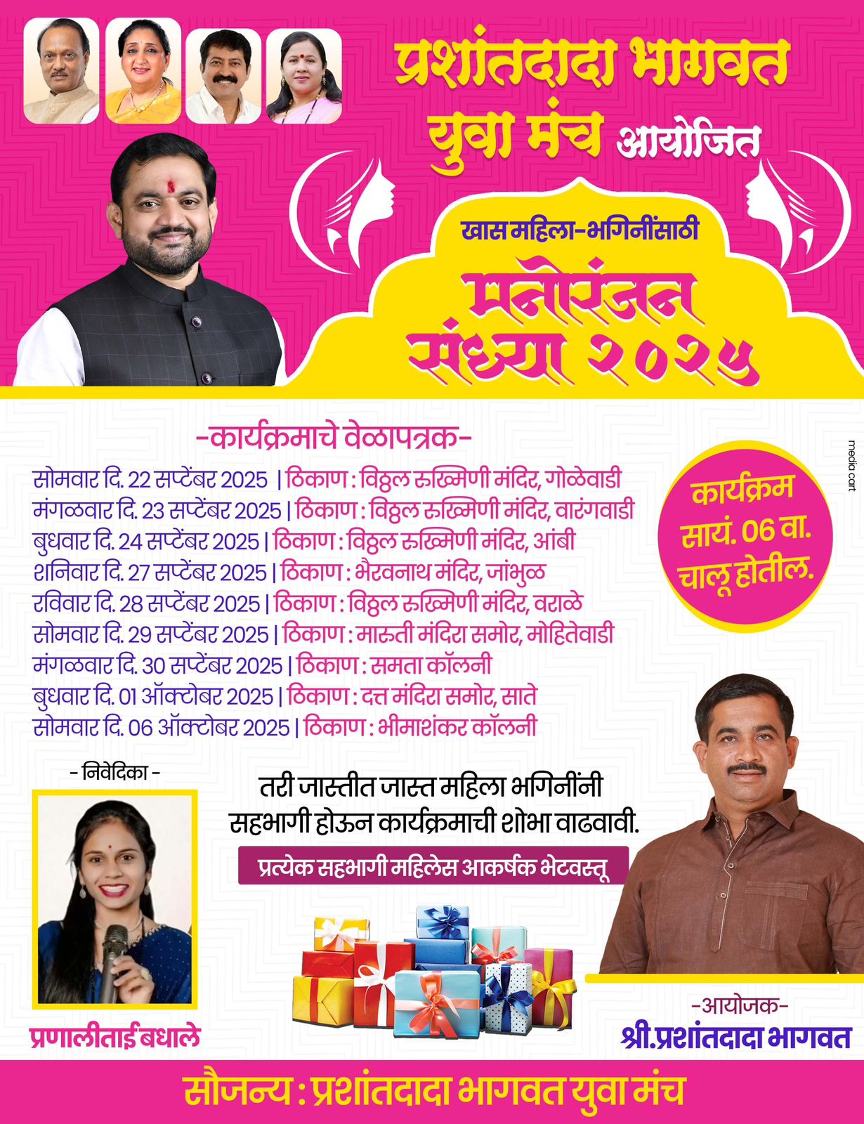 इंदोरी : सांस्कृतिक आणि सामाजिक उपक्रमांद्वारे गावागावांत लोकांच्या मनात वेगळं स्थान निर्माण करणारे श्री. प्रशांतदादा भागवत यांच्या प्रेरणेने प्रशांतदादा भागवत युवा मंच तर्फे महिलांसाठी खास असा आगळावेगळा उपक्रम सुरू होत आहे. “मनोरंजन संध्या २०२५” या नावाने आयोजित करण्यात आलेल्या या सोहळ्यात महिलांसाठी हास्य, खेळ, गाणी, मैफली अशा रंगतदार कार्यक्रमांचा मेळा रंगणार आहे. सोमवार दि. २२